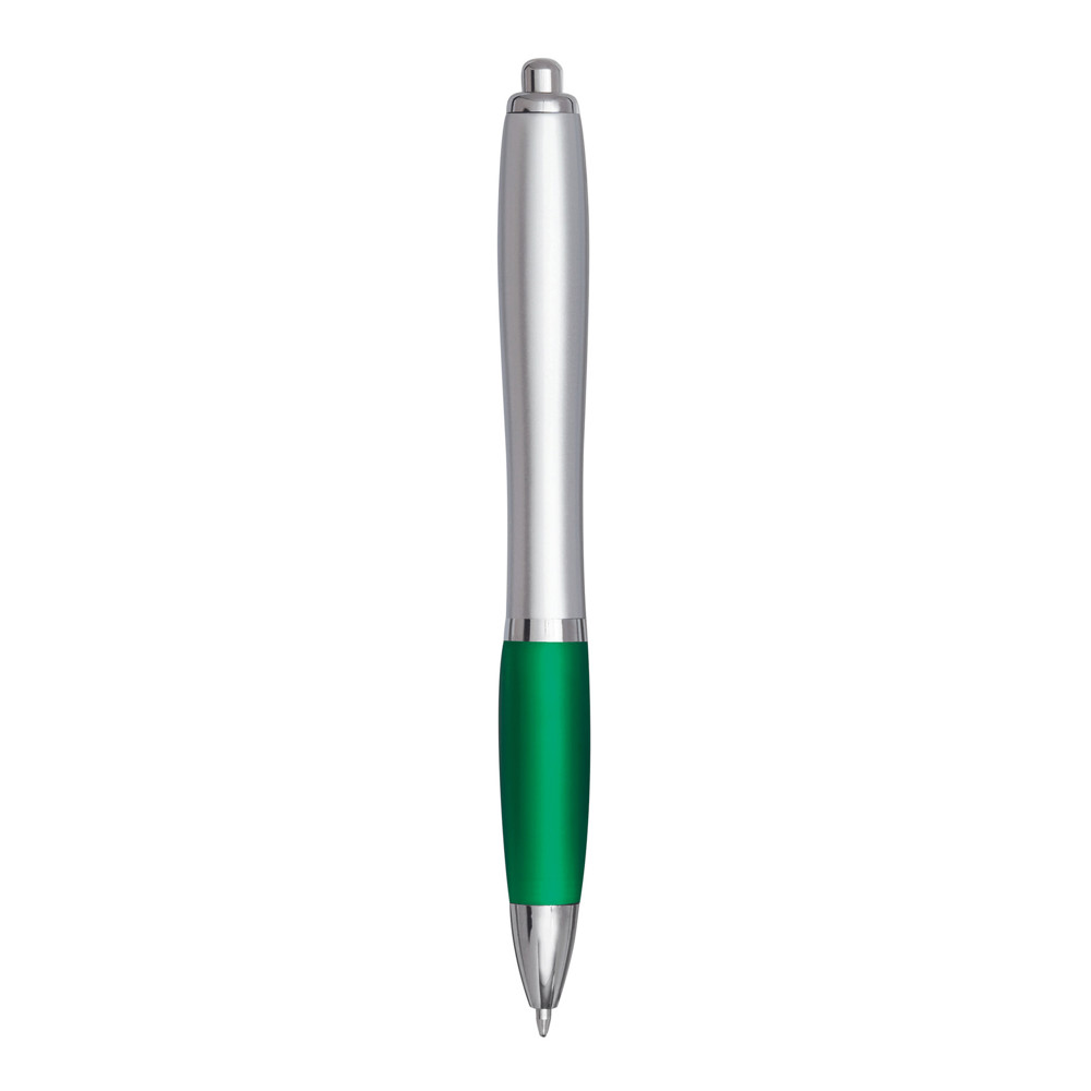 Kugelschreiber SWAYRABS: mit Schaft in taillierter Form aus recyceltem Kunststoff, gummierter Griffzone, Druckmechanismus, Großraummine, blauschreibend
