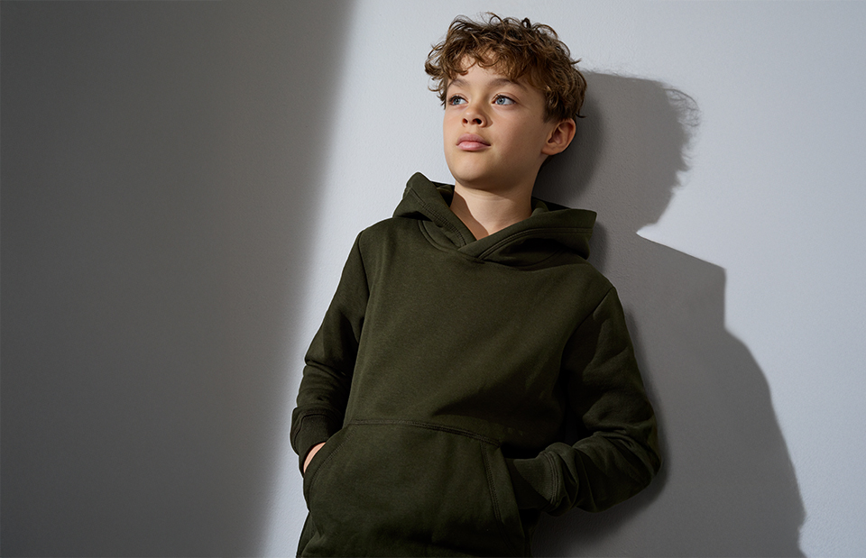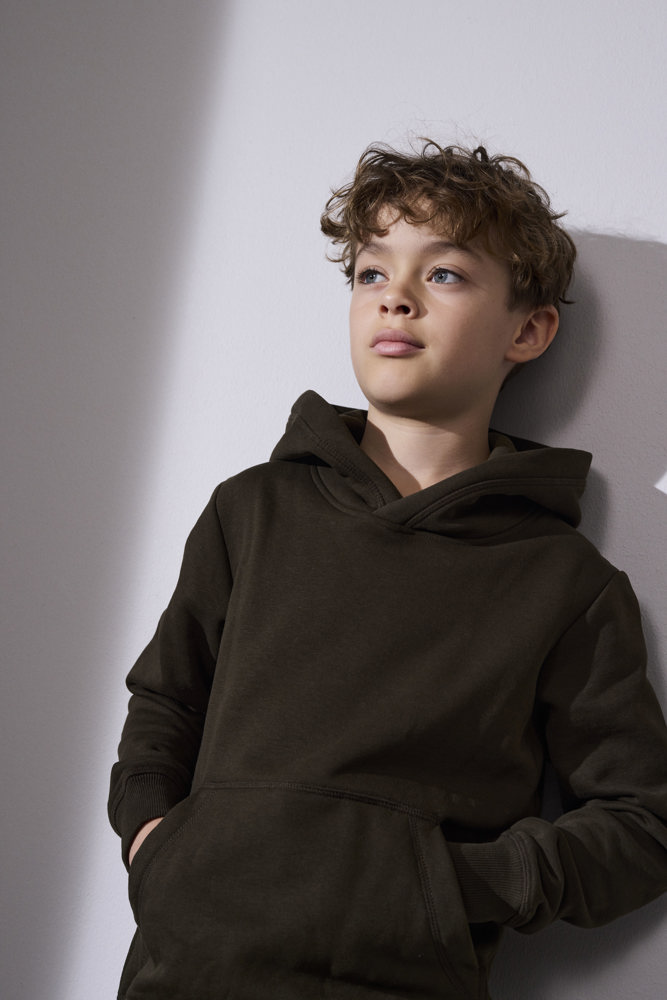 Klassisches Kinder-Kapuzensweatshirt mit Kängurutasche in neuer und moderner Passform. Rippabschluss an Ärmeln und Bund. Weiche, angeraute Innenseite.