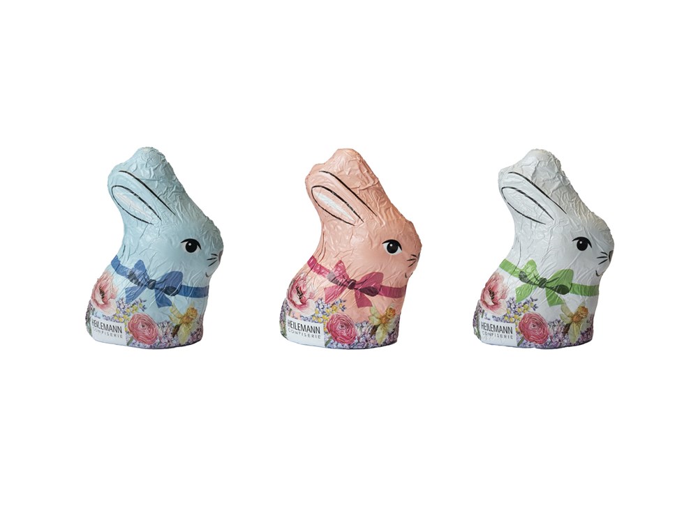 Die bunten Osterhasen in drei verschiedenen Farben und mit niedlichem Blumendesign versüßen jedes Osternest. Eine großzügige Werbefläche bietet die individuell gestaltbare Werbebox mit Sichtfenster. , Geschmack: Edelvollmilch-Schokolade , VE: 50 Stück