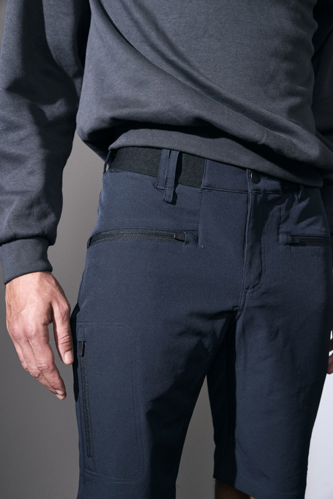 Sportliche, lässige Stretchshorts aus leichtem und weichem Material. Das Gummiband im Bund bietet guten Komfort und Flexibilität. Gürtelschlaufen und Schlüssel-/Karten-Riemen. Sichtbare YKK-Reißverschlüsse an den Vordertaschen und an der Oberschenkeltasche. Normale Passform.