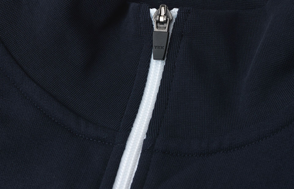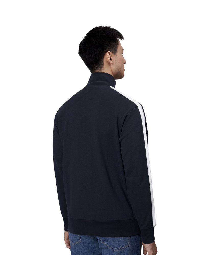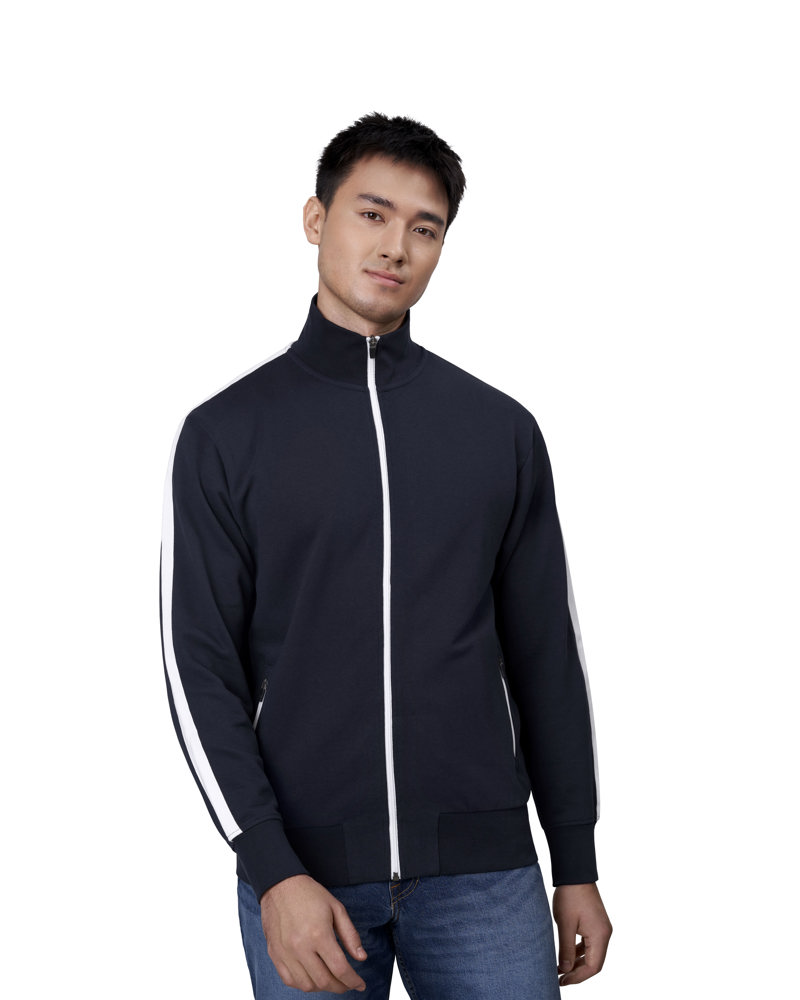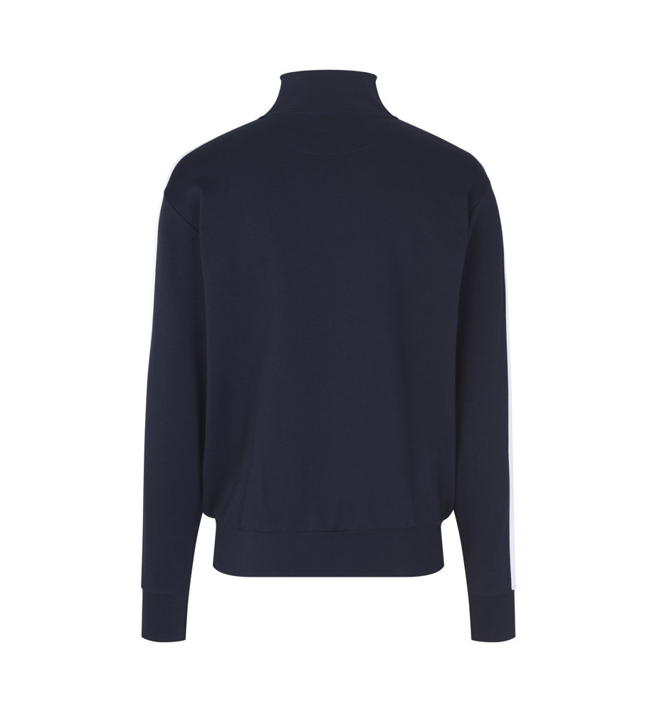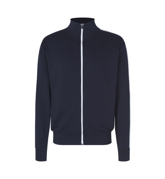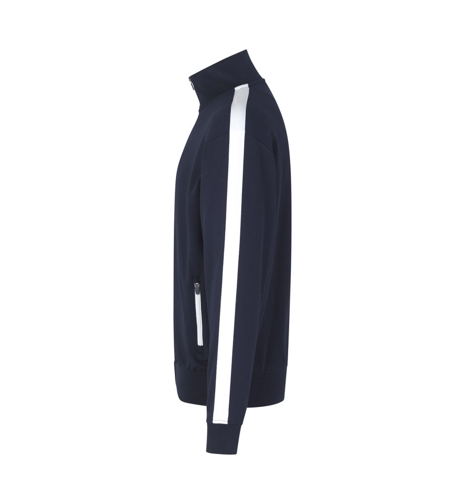 Sportliche Jacke in kräftiger Qualität mit Kontraststreifen an den Ärmeln. Durchgehender Reißverschluss und zwei Seitentaschen mit Reißverschluss in Kontrastfarbe. Nackenband, Nackenspiegel und Ripp an Ärmel und Bund. Unangeraute Innenseite.