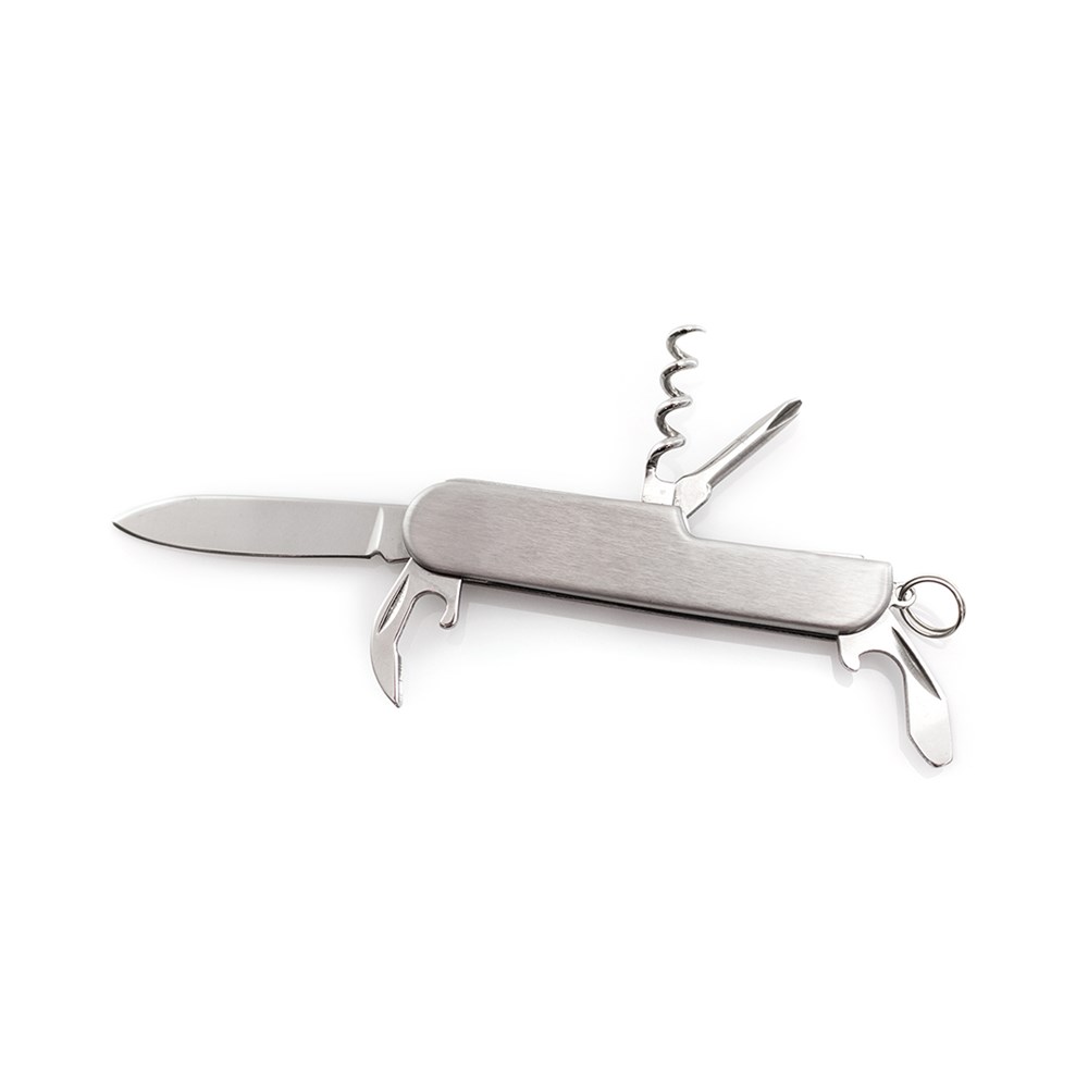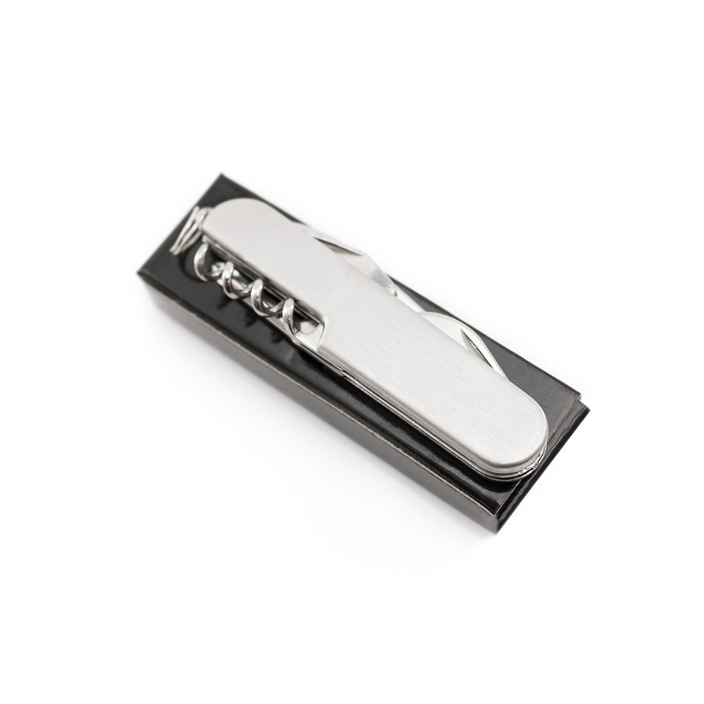 Vielseitig verwendbares Taschenmesser mit 6 Funktionen. Enthält Messer, verschiedene Öffner, Schraubendreher und Schlüsselring. Präsentiert in einer individuellen Box.