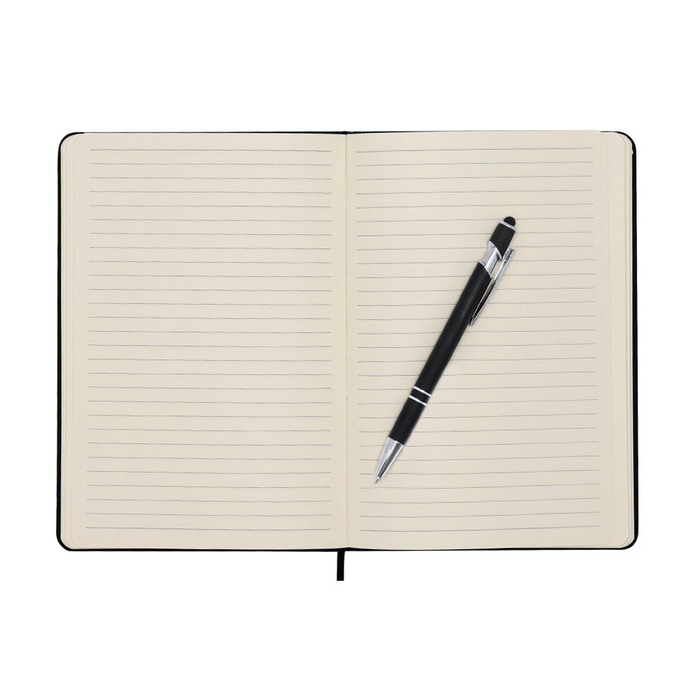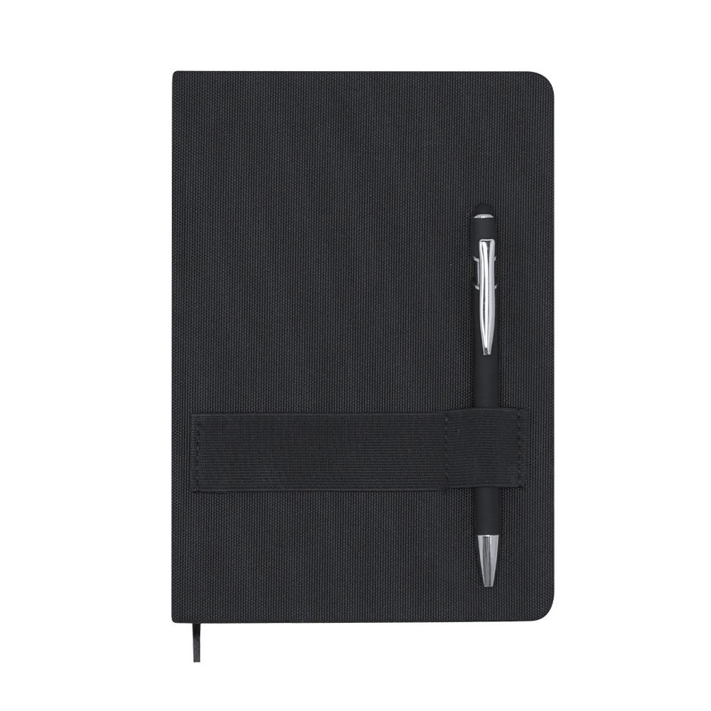 A5-Notizblock aus elegantem RPET. Starre Überzüge in Stoffoberfläche. Beinhaltet ein Gummiband am Deckel, ideal zum Aufbewahren eines Handys, sowie einen elastischen Stifthalter. Innenseite mit 80 Seiten auf einem Streifen, Band-Lesezeichen in Kombination und Umschlag auf den Rückseiten. Enthält Stift mit blauer Tinte, Aluminium-Gummilack, Metallclip und eine Druckknopffunktion in Kombination. Es zeigt ein markantes RPET-Logo.