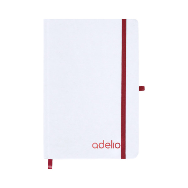 Notizblock mit steifen weißen Einbänden aus recyceltem Karton. Innenraum mit 80 verfügbaren Blättern für einen Streifen. Enthält ein Lesezeichen, in derselben Farbe wie elastisches Verschlussband und Stifthalter. Spezial für Lasergravuren, die die ausgewählte Farbe zeigt.