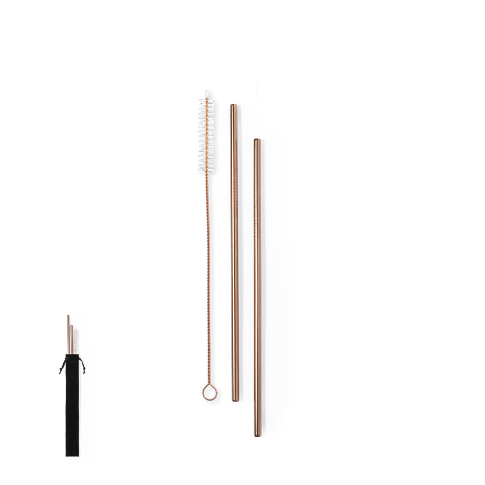 2er-Set Strohhalme aus rostfreiem Stahl mit galvanisierter Kupferbeschichtung auf der Außenseite. Inklusive Reinigungsbürste und in einem schwarzen Wildlederetui mit Kordelzugverschluss präsentiert.