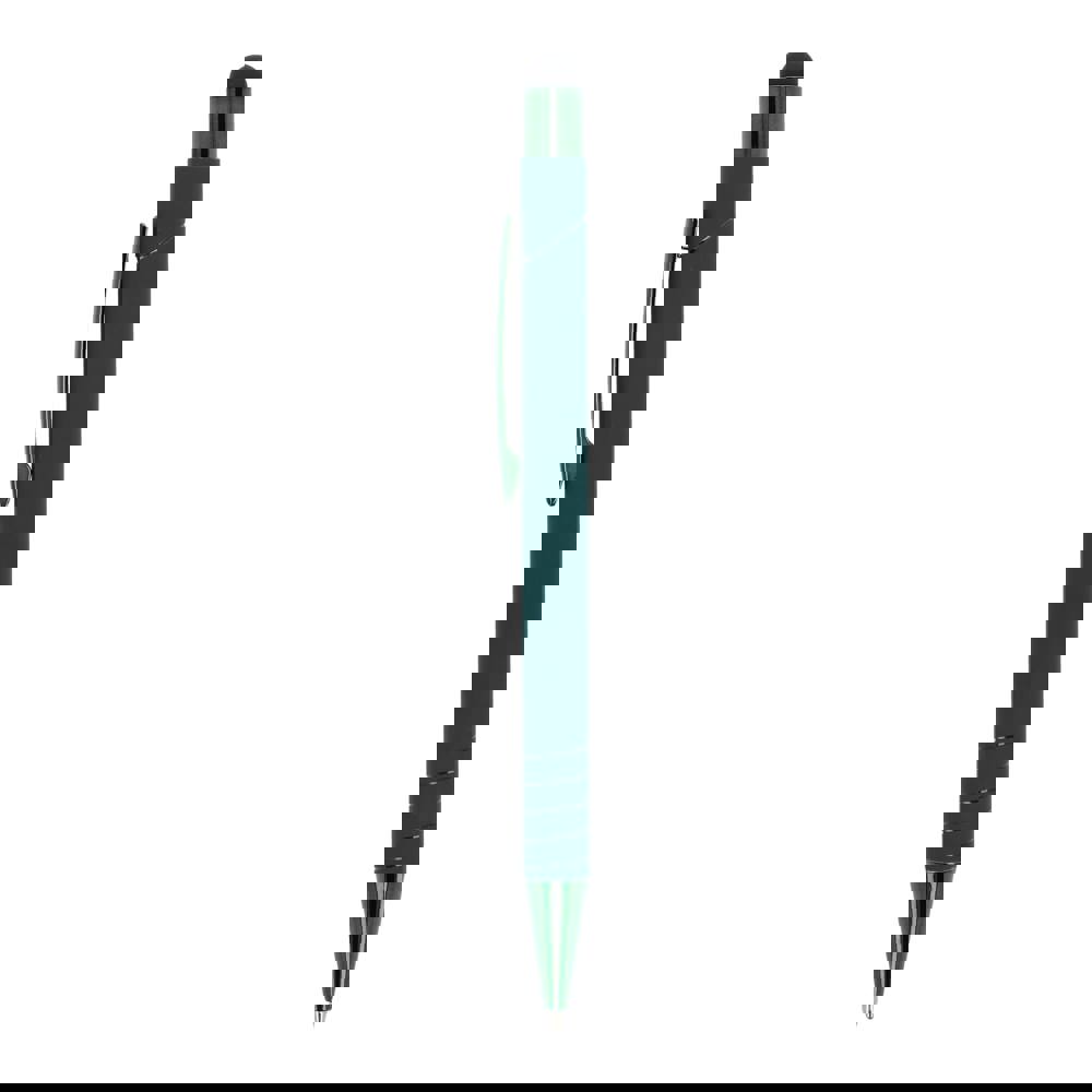 Kugelschreiber mit Metallclip, Stylus-Funktion und Softtouch-Oberfläche. Der Druckknopf, der Clip und die Ringe sind in passenden glänzenden Farben gehalten. Der Kugelschreiber wird mit einer blauen Jumbo-Mine geliefert.