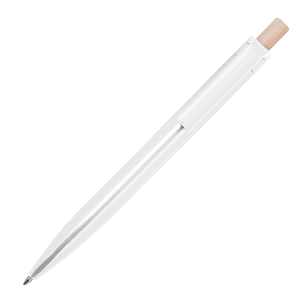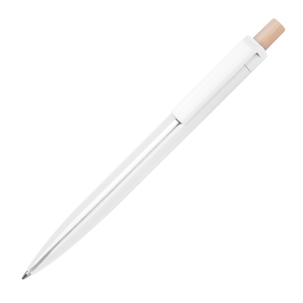Kugelschreiber aus recyceltem ABS und einem Drücker aus Bambus. Er verfügt über eine blauschreibende Kunststoffmine. Ihre Werbung drucken wir unterhalb vom Clip aus den Schaft.