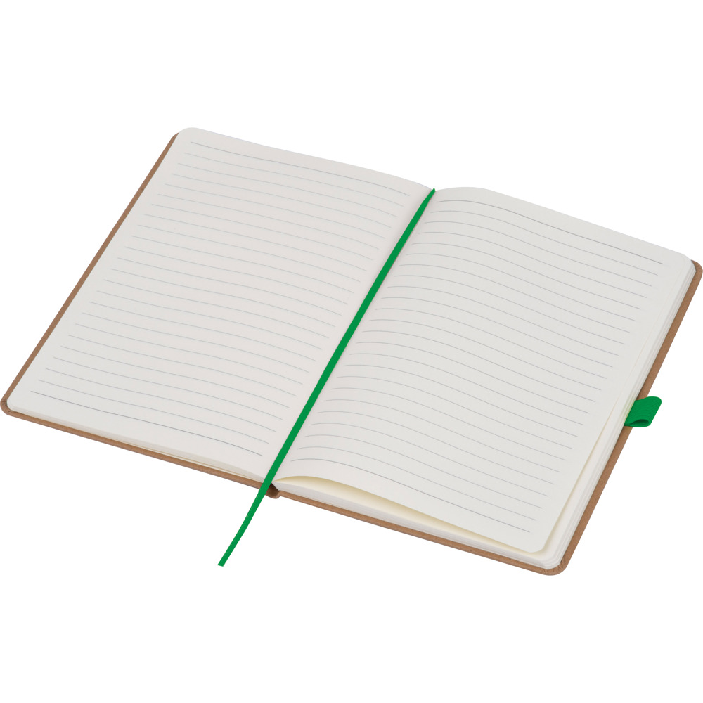 A5 Notizbuch aus recyceltem Papier mit 160 linierten Seiten, einem Lesezeichen sowie einer Kugelschreiberschlaufe die farblich auf das Verschlussband abgestimmt ist. Ihre Werbung drucken wir außen auf das Cover.