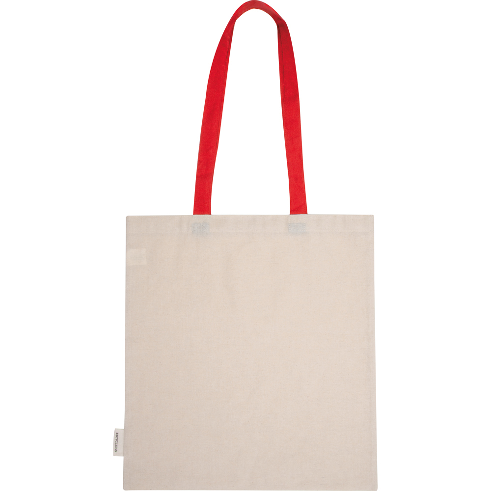 Baumwolltasche mit zwei langen Henkel aus 75% recycelter Baumwolle und 25% recyceltem PET. Grammatur 140 gsm. Ihre Werbung bringen wir auf einer Seite der Tasche an.