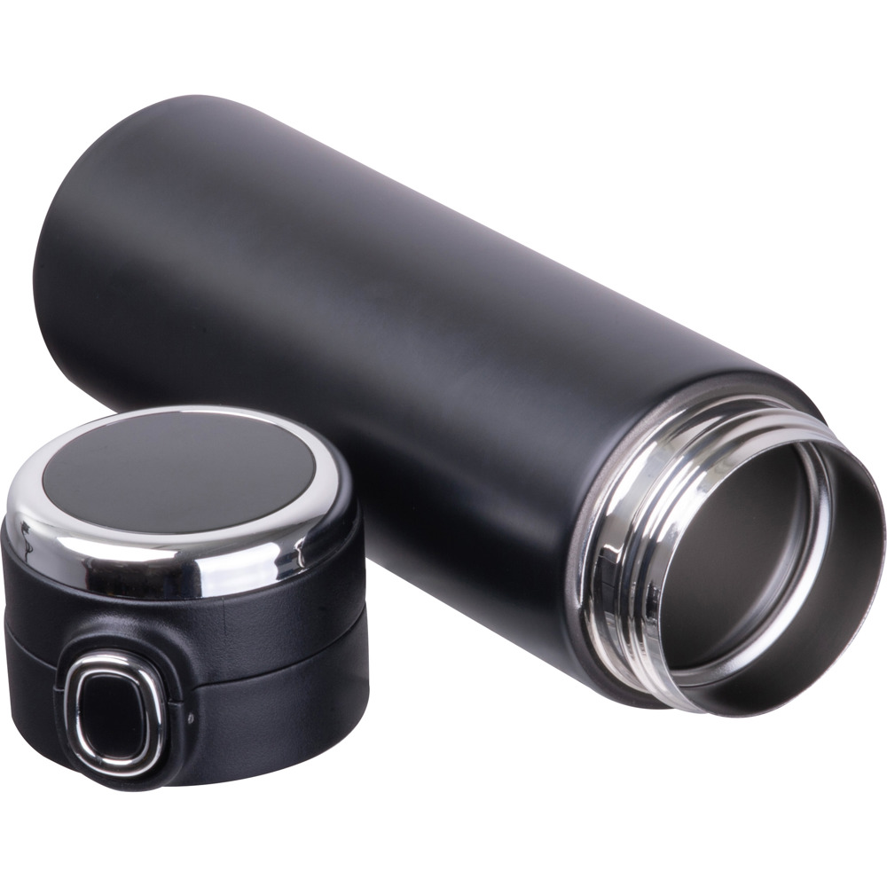 Vakuum Isolierflasche (Fassungsvolumen 420 ml) aus Edelstahl mit Temperaturanzeige im Deckel und Sicherheitsverschluss. Max. Temperaturanzeige 99°C. Ihre Werbung bringen wir mittels einer Lasergravur auf der Flasche an.