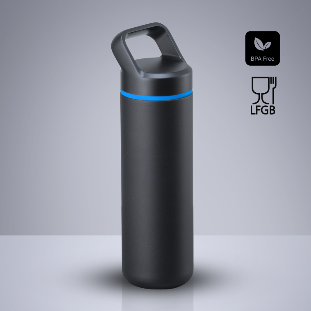 Eine schlanke, langlebige Wasserflasche aus hochwertigem POSCO-Edelstahl für eine langfristige Nutzung. Mit praktischem Tragegriff am Deckel und farbiger Silikondichtung für einen sicheren, auslaufsicheren Verschluss. BPA-frei und LFGB-zertifiziert, sicher für alle Getränke.