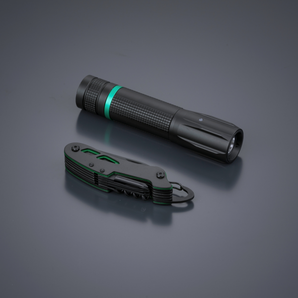 Das praktische Set umfasst ein Titan-Taschenmesser und eine handliche kleine Taschenlampe. Das Optima-Taschenmesser in neuer Ausführung besteht aus hochwertigem Edelstahl mit Titanbeschichtung für erhöhte Härte und zusätzlichen Korrosionsschutz. Farbige Einsätze im Griff sorgen für eine dezente Optik. Die LED-Taschenlampe ist aus hochwertigem Aluminium gefertigt und verfügt über einen Stroboskop- sowie SOS-Modus.