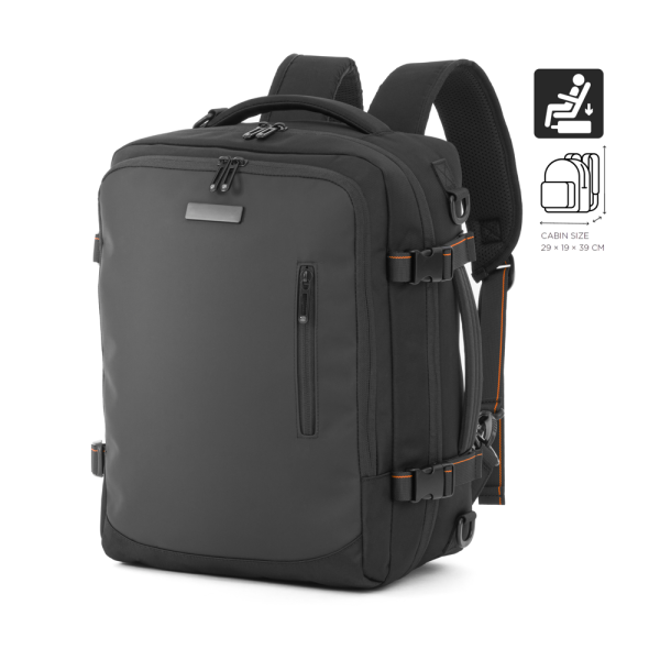 Ein kompakter und vielseitiger Kabinenrucksack aus Polyester mit Bambusstruktur und matten TPU-Akzenten. Er verfügt über zwei Fächer, verstellbare Seitenriemen, einen oberen und seitlichen Tragegriff sowie verstaubare Schultergurte für flexibles Tragen. Der Innenraum ist wie ein Koffer gestaltet und ermöglicht eine übersichtliche Organisation. REACH-zertifiziert.