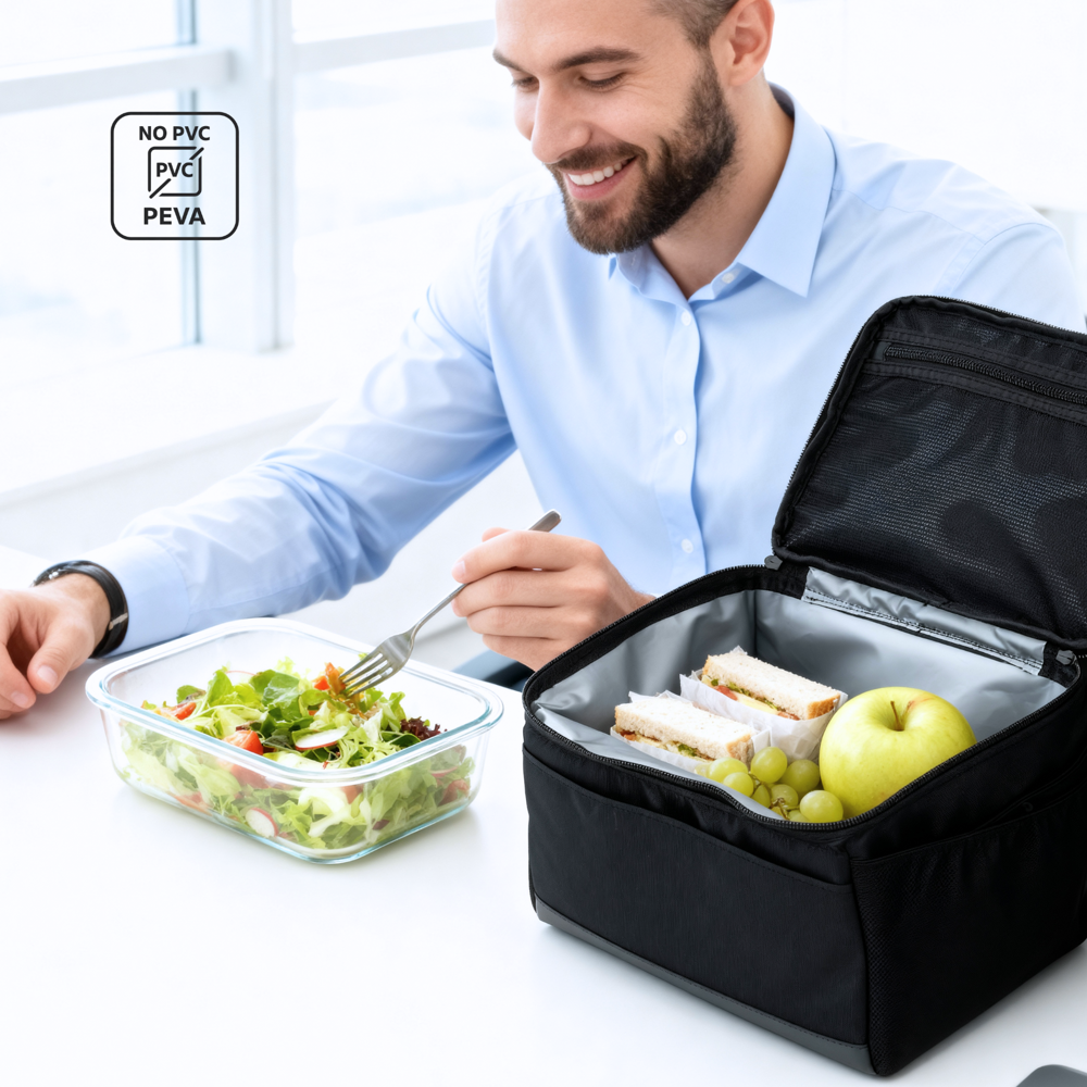 Eine praktische und geräumige Kühltasche für den täglichen Gebrauch und Reisen. Gefertigt aus strapazierfähigem 600D-Polyester mit PU-Beschichtung und PEVA-Thermofutter, hält sie Lebensmittel und Getränke frisch. Mit isoliertem Hauptfach, Reißverschlusstasche in der oberen Klappe, elastischer seitlicher Netztasche, Fronttasche und bequemem Tragegriff aus Gurtband.
