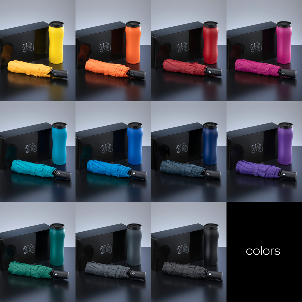 Ein praktisches Set für unterwegs, bestehend aus einem Vakuum-Thermobecher aus der Primo-Kollektion und einem faltbaren Automatikschirm. Der auslaufsichere Thermobecher besteht aus hochwertigem Edelstahl und ist mit einer matten Pulverbeschichtung versehen, die nicht nur Haltbarkeit, sondern auch ein tolles Aussehen bietet. Doppelwände halten die gewünschte Temperatur bis zu 6 Stunden lang perfekt. Der Klickverschluss hält Ihr Getränk heiß und sicher. Das Produkt ist für den Lebensmittelkontakt zertifiziert und BPA-frei. Der Faltschirm ist ein hochwertiges Produkt aus der Primo-Kollektion mit DAS (Double Automatic System – automatisches Schließen und Öffnen) und dem Anti-Wind-System. Merkmale: ein solider Metallrahmen, mit Glasfaser überzogene Rippen, ein mit PU überzogener Griff. Das Produkt ist REACH-zertifiziert. Das Set ist in einer eleganten schwarzen Kartonverpackung verpackt.