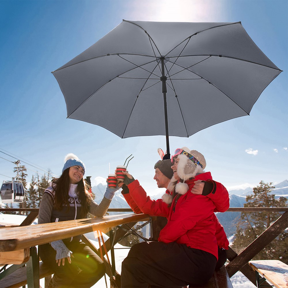 Moderner Sonnenschirm mit Gestell in Titan-Finish und Knickvorrichtung Einfache Handhabung durch Sicherheitsschieber, sehr stabile Fiberglasschienen, zweiteiliger und stufenlos höhenverstellbarer Stock mit Knickvorrichtung zur Neigung des Schirms, Stock in edlem Titan-Finish, Unterstock mit ca. 119 cm Länge und Drehfeststeller zur sicheren Fixierung, komfortables Tragefutteral, hochqualitativer Bezug mit einer Grammatur von ca. 200 g/m² und Lichtschutzfaktor UPF 50+, exklusive Füllständer (Art. 8920 oder Art. 8905) / Erdspieß (Art. 8939)