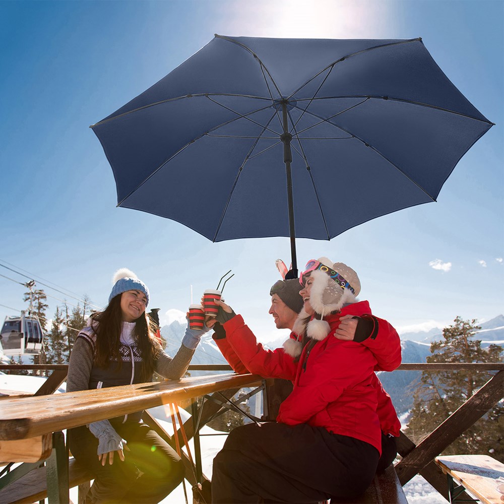 Moderner Sonnenschirm mit Gestell in Titan-Finish und Knickvorrichtung Einfache Handhabung durch Sicherheitsschieber, sehr stabile Fiberglasschienen, zweiteiliger und stufenlos höhenverstellbarer Stock mit Knickvorrichtung zur Neigung des Schirms, Stock in edlem Titan-Finish, Unterstock mit ca. 119 cm Länge und Drehfeststeller zur sicheren Fixierung, komfortables Tragefutteral, hochqualitativer Bezug mit einer Grammatur von ca. 200 g/m² und Lichtschutzfaktor UPF 50+, exklusive Füllständer (Art. 8920 oder Art. 8905) / Erdspieß (Art. 8939)