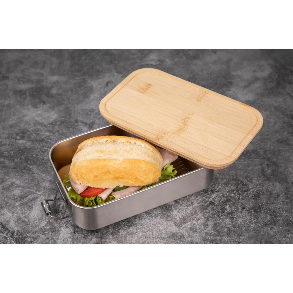 Edel und praktisch. Die große Vorratsdose besteht aus Edelstahl, der zugehörige Deckel aus Bambus. Dank des eingepassten Silikonrings und der beiden Klemmbügel lässt sich die Box sicher verschließen. Der Deckel ist abnehmbar und kann bei Bedarf auch als Brotzeitunterlage verwendet werden.