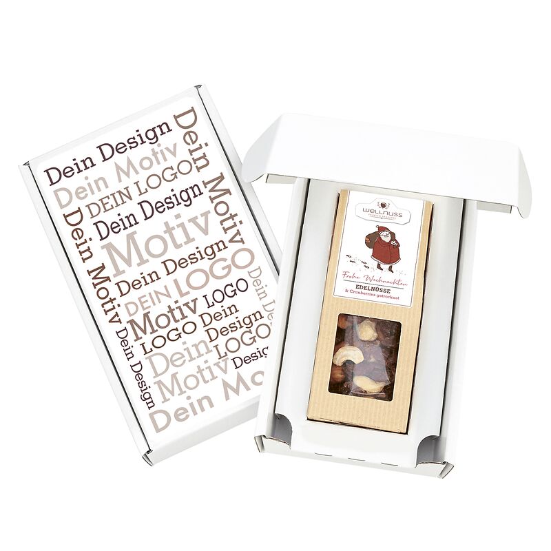 Ab 100 Stück mit Ihrem Etikett im 4c Druck auf dem Deckel des Geschenkkartons, ab 1.000 Stück vollflächig bedruckt im Offsetdruck: Der Geschenkkarton ist portooptimiert und kann ohne Umkarton versendet werden. Wählen Sie aus den beliebtesten Weihnachten-Snacks: Gebrannte Mandeln, Trüffelmandeln mit Kakao und Haselnusskerne mit Vollmilch und Zimt. Viele weitere Snack-Kompositionen auf Anfrage. Mit Liebe konfektioniert in Deutschland. Sie suchen eine andere Größe? Dieses Premium Präsent ist auch mit 2, 3 oder 4 Faltschachteln erhältlich.