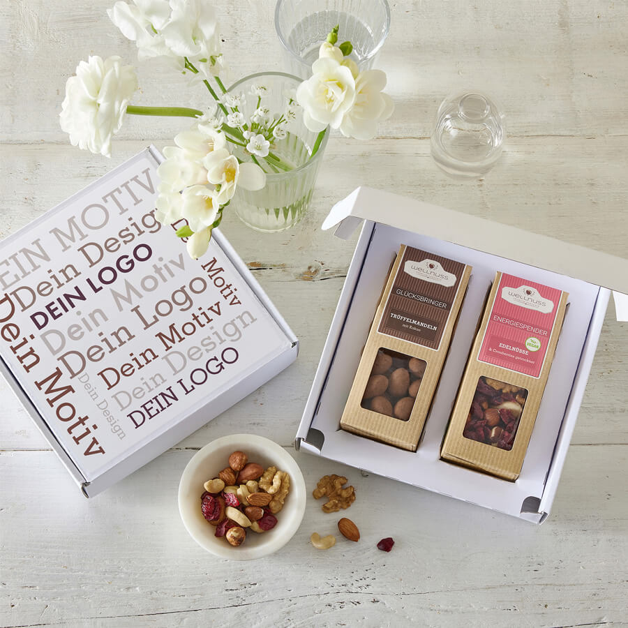 Ab 100 Stück mit Ihrem Etikett im 4c Druck auf dem Deckel des Geschenkkartons, ab 1.000 Stück vollflächig bedruckt im Offsetdruck: Der Geschenkkarton ist portooptimiert und kann ohne Umkarton versendet werden. Wählen Sie aus einem breiten Sortiment von edlen Nüssen, verführerischer Schokolade und Trockenfrüchten. Sie suchen eine andere Größe? Dieses Premium Präsent ist auch mit 1, 3 oder 4 Faltschachteln erhältlich.