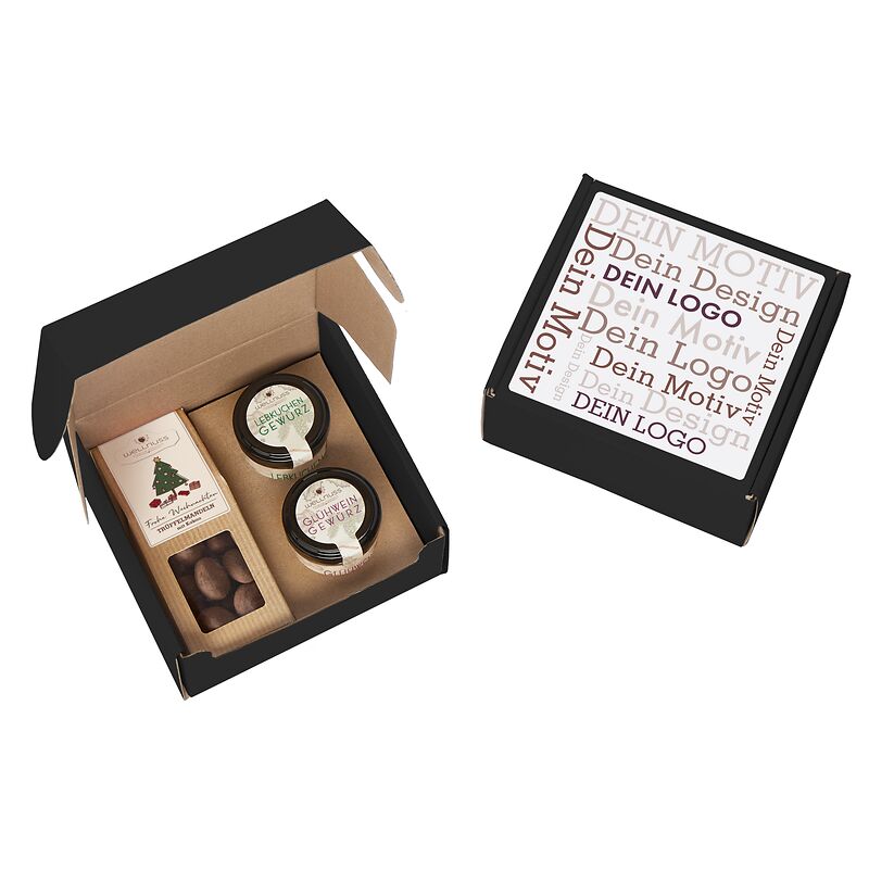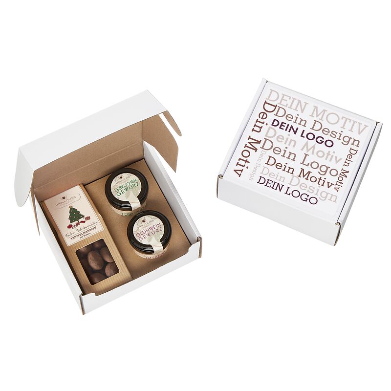 Ab 100 Stück mit Ihrem Etikett im 4c Druck auf dem Deckel des Geschenkkartons, ab 1.000 Stück vollflächig bedruckt im Offsetdruck: Verschenken Sie Gourmet Gewürze und Premium Snacks ohne künstliche Zusatzstoffe und mit Liebe konfektioniert in Deutschland.