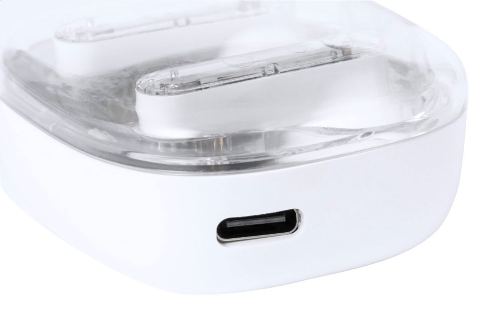Semi-transparente, kabellose Stereo-Ohrhörer (TWS) mit sichtbaren elektronischen Komponenten und Freisprechfunktion. In halbtransparentem Kunststoff-Ladeetui. Inklusive USB-Ladekabel.