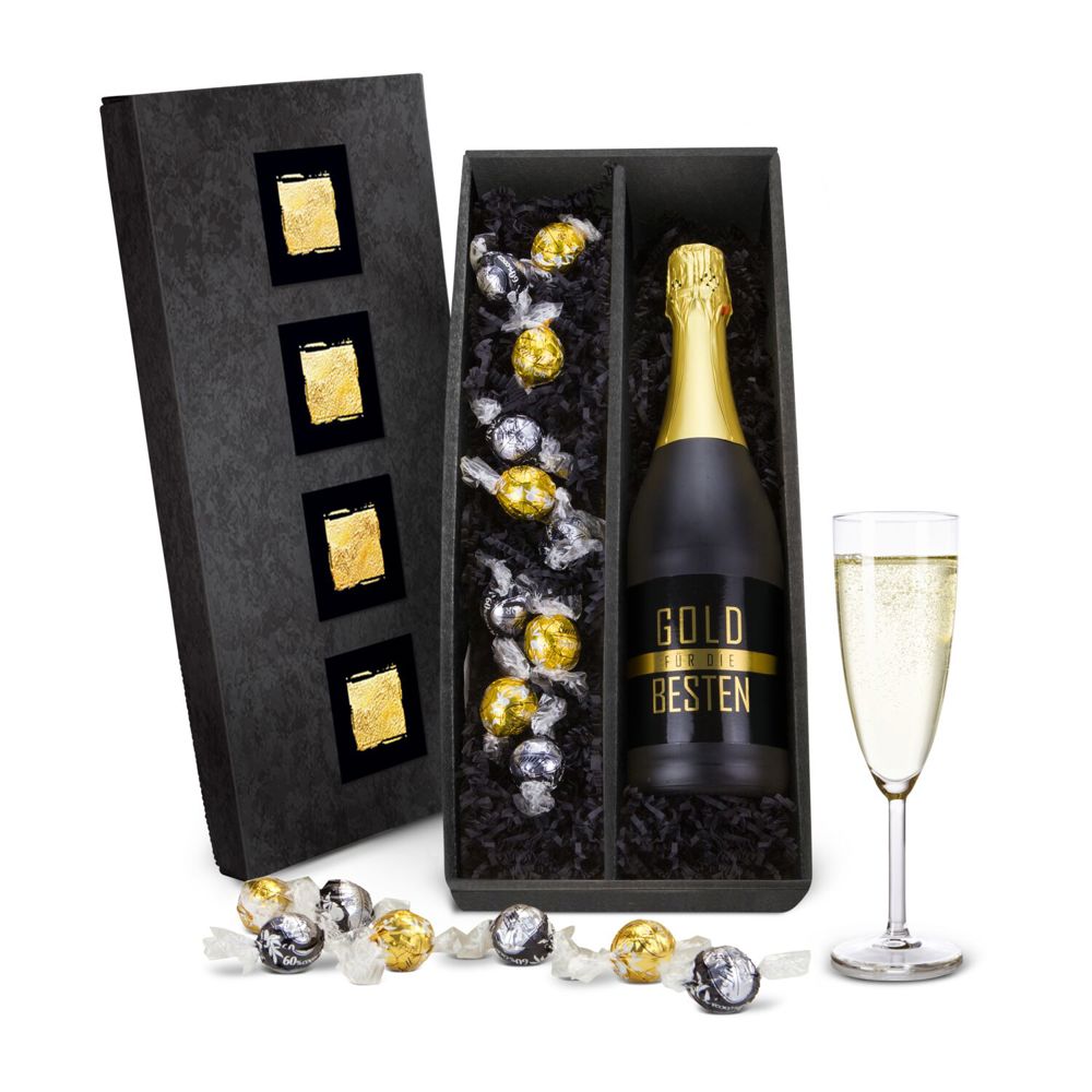 Goldene Momente „für die Besten“ oder andere wertvolle Menschen! Verschenken Sie einen hochwertigen Sekt in matt-schwarzer Flasche (Villa Römer Cuvée 0,75 l) kombiniert mit 5 goldenen und 5 schwarzen Lindt Lindor-Kugeln (ca. 125 g). Dabei ist Schwarz und Gold eine edle Kombination, die Ihre Wertschätzung ideal zum Ausdruck bringen wird. Das Set wird abgerundet durch schwarzes Sizzle und einen schwarzen Karton mit goldener Prägung.