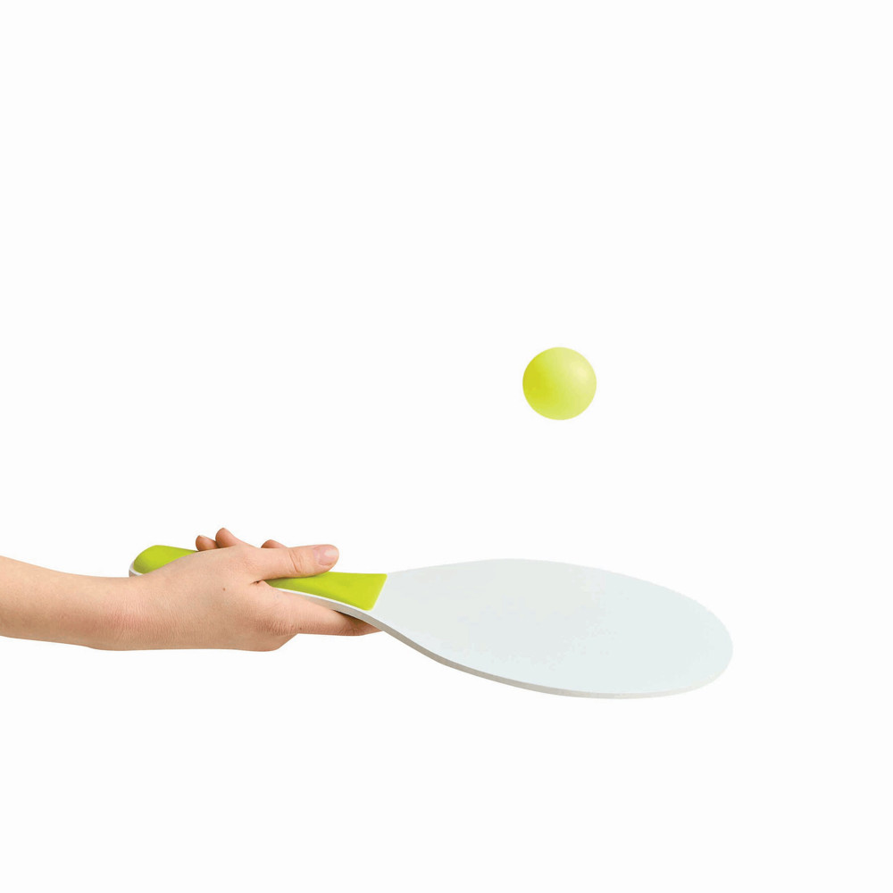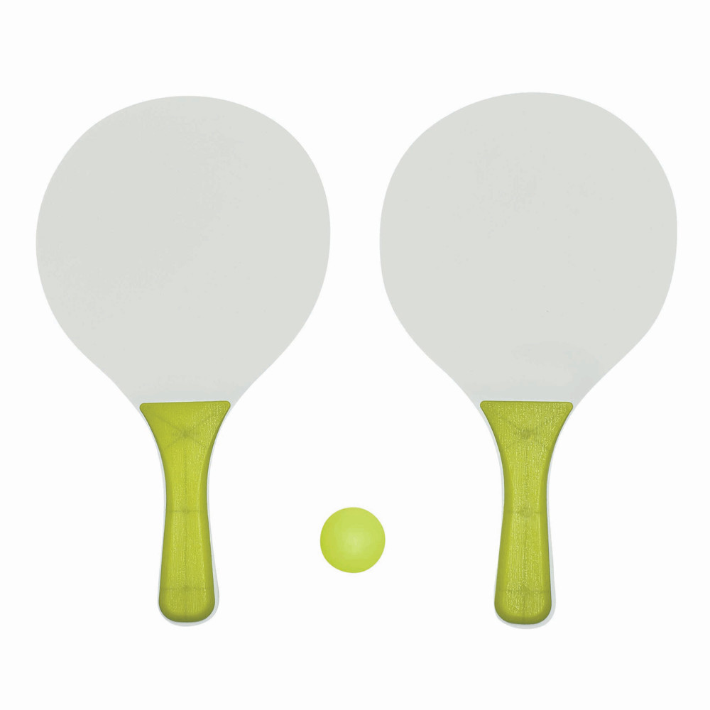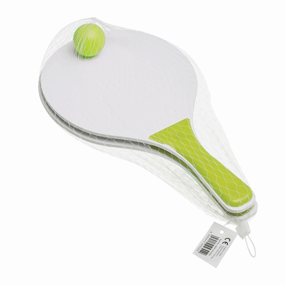 Beachball-Set SUMMER FEELING, 3-teilig: bestehend aus 2 Holzschlägern mit farbigen Griffen und 1 Softball, im Netzbeutel