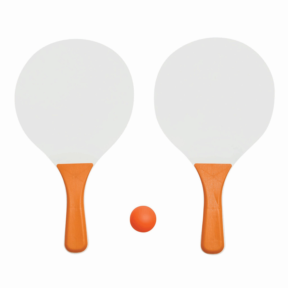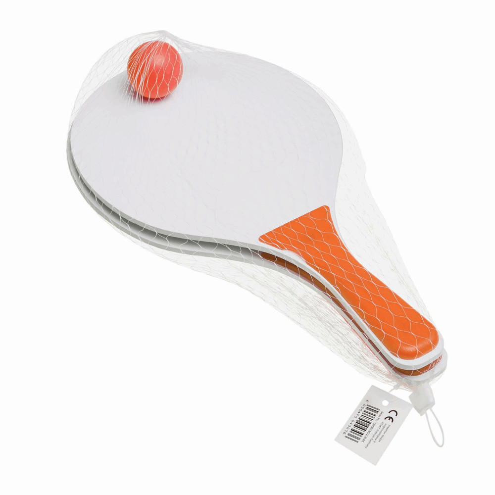 Beachball-Set SUMMER FEELING, 3-teilig: bestehend aus 2 Holzschlägern mit farbigen Griffen und 1 Softball, im Netzbeutel