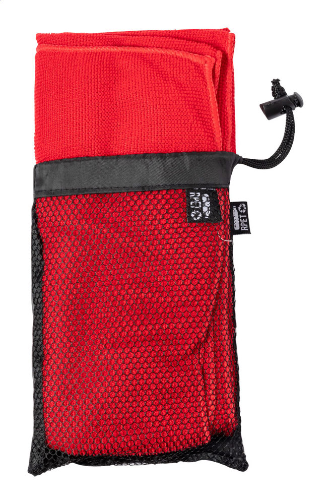 Sporthandtuch aus Mikrofaser mit RPET-Beutel und abtrennbarem RPET-Label. Material: RPET-Polyester (160 g/m²).