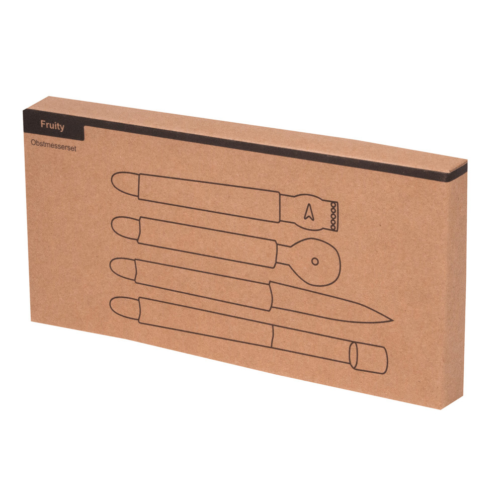Obstmesser-Set FRUITY, 4-teilig: bestehend aus Orangenmesser, Zitronenschaber, Fruchtfleischlöffel und Apfelentkerner, alle Messer mit praktischer Aufhängeöse, in Box