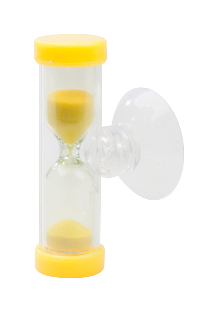 Sanduhr mit farblich abgestimmten Sand und Verschlusskappen, Laufzeit: 3 Min., Bedruckung erfolgt auf der Rückwand aus Papier.