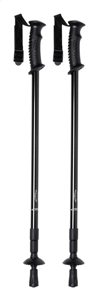 2-tlg. Nordic-Walking-Set mit Aluminium-Stöcken, ergonomischen Griffen, Handgelenkschlaufen und Anti-Shock-System. Verpackt ist das Set in einer Tragetasche zusammen mit den Schnee-Aufsätzen.