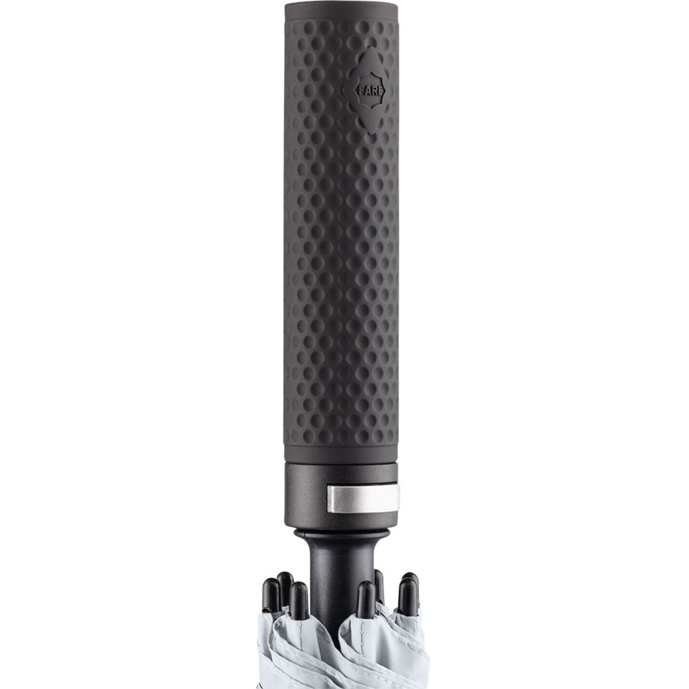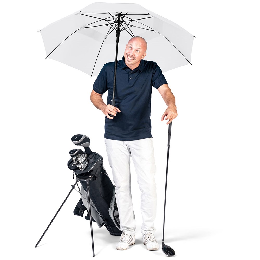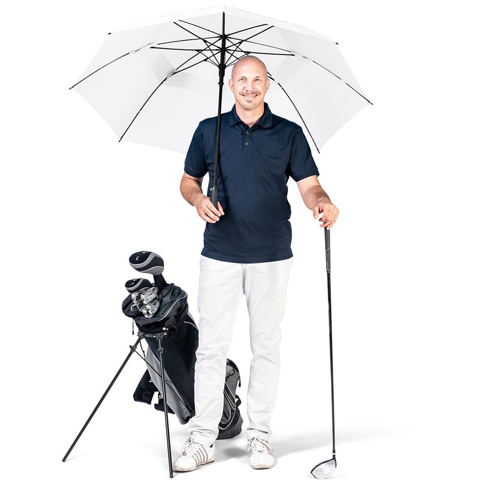 Exklusiver Automatik-Golf-/Gästeschirm für zwei Personen mit Golf-Design-Griff Komfortable Automatik-Funktion zum schnellen Öffnen, hochwertiges Windproof-PLUS-System für eine maximale Gestell-Flexibilität bei stärkeren Windböen, stabiler Fiberglasstock, flexible Fiberglasschienen, überlappender Ventilationsbezug zur Regulierung von Überdruck durch stärkere Windböen, Bezug mit zwei Schließbändern zur optimalen Fixierung im geschlossenen Zustand, exklusiver Soft-Touch-Griff in Golfball-Haptik mit silberner Auslösetaste und Werbeanbringungsmöglichkeit, komfortables Tragefutteral, gastfreundlicher großer Durchmesser