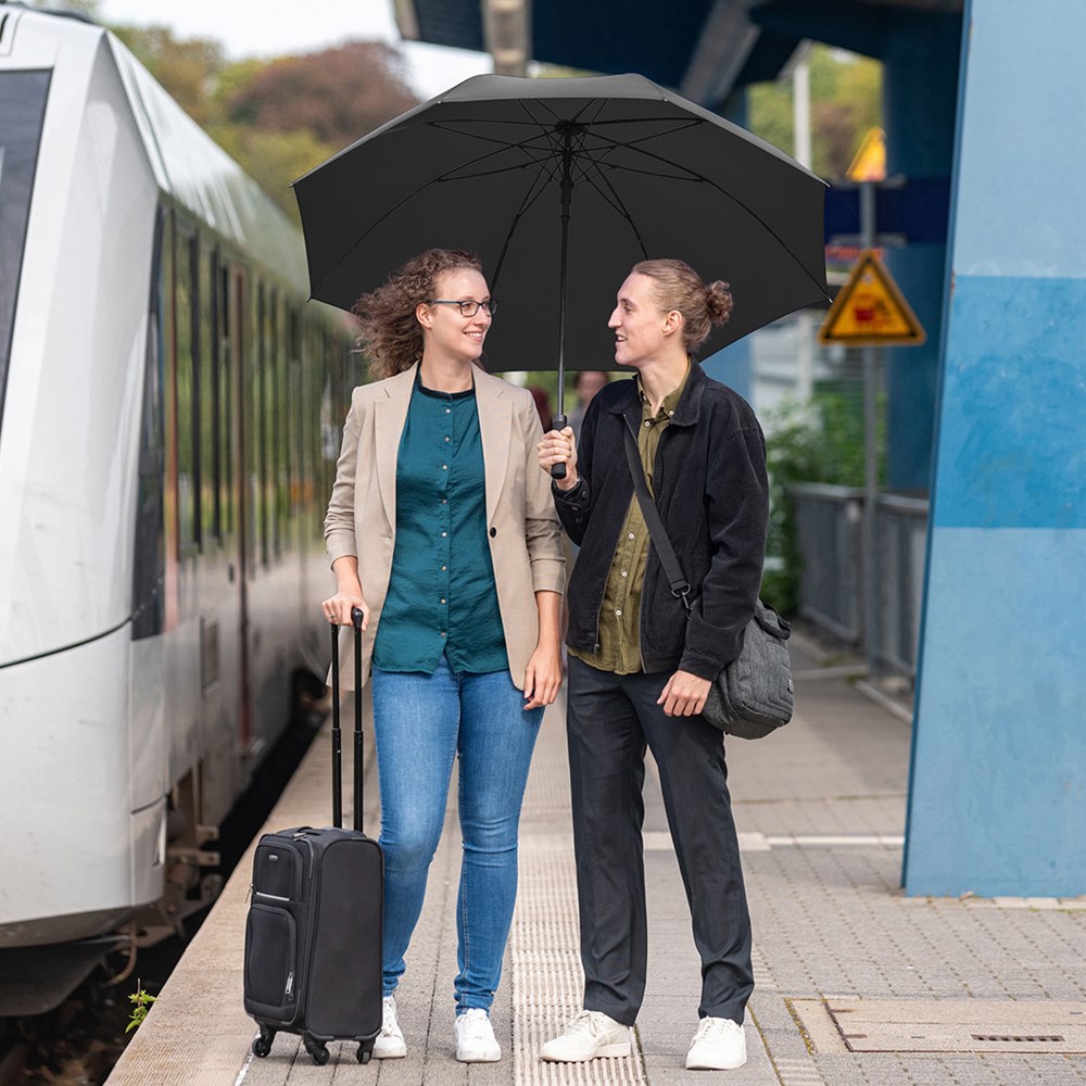 Äußerst stabiler Automatik-Gästeschirm für zwei Personen mit riesigem Durchmesser Komfortable Automatik-Funktion zum schnellen Öffnen, hochwertiges Windproof-PLUS-System für eine maximale Gestell-Flexibilität bei stärkeren Windböen, stabiler Fiberglasstock, flexible Fiberglasschienen, gerader Softgriff mit schmaler Auslösetaste, gastfreundlicher Durchmesser
