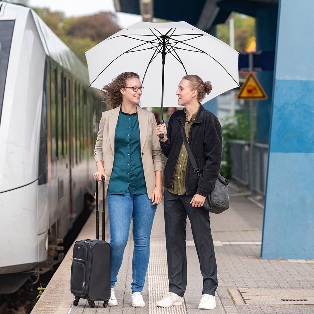 Äußerst stabiler Automatik-Gästeschirm für zwei Personen mit riesigem Durchmesser Komfortable Automatik-Funktion zum schnellen Öffnen, hochwertiges Windproof-PLUS-System für eine maximale Gestell-Flexibilität bei stärkeren Windböen, stabiler Fiberglasstock, flexible Fiberglasschienen, gerader Softgriff mit schmaler Auslösetaste, gastfreundlicher Durchmesser