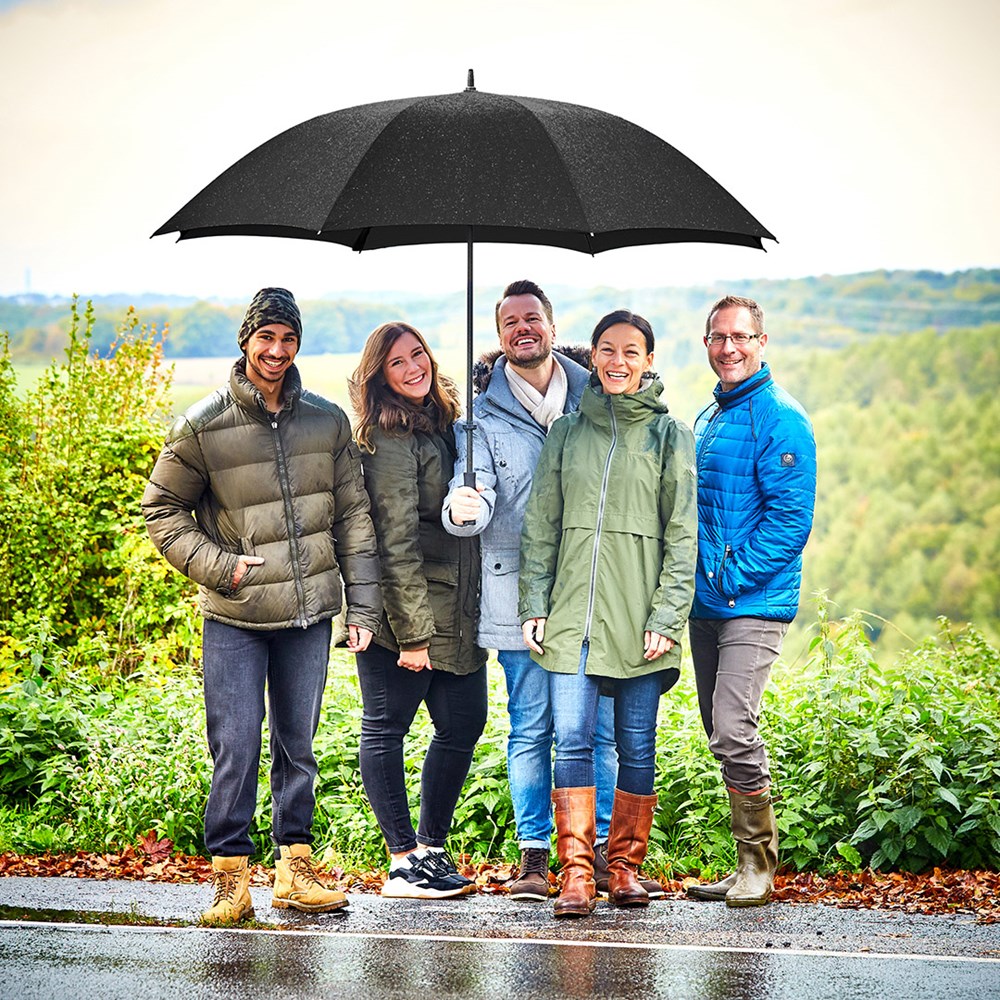 Riesiger Portier-Golf-/Gästeschirm für bis zu sieben Personen Einfache Handhabung durch Sicherheitsschieber, hochwertiges Windproof-PLUS-System für eine maximale Gestell-Flexibilität bei stärkeren Windböen, sehr stabiler und dicker Fiberglasstock, stabile Fiberglasschienen, extrem großes Schirmdach zum Schutz mehrerer Personen, handsympathischer Soft-Griff mit Werbeanbringungsmöglichkeit, gastfreundlicher großer Durchmesser für bis zu sieben Personen