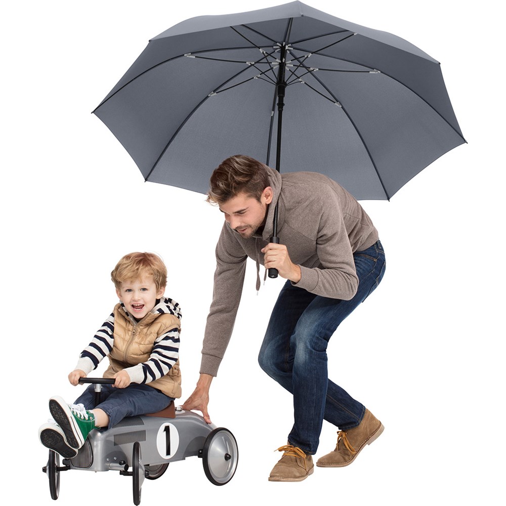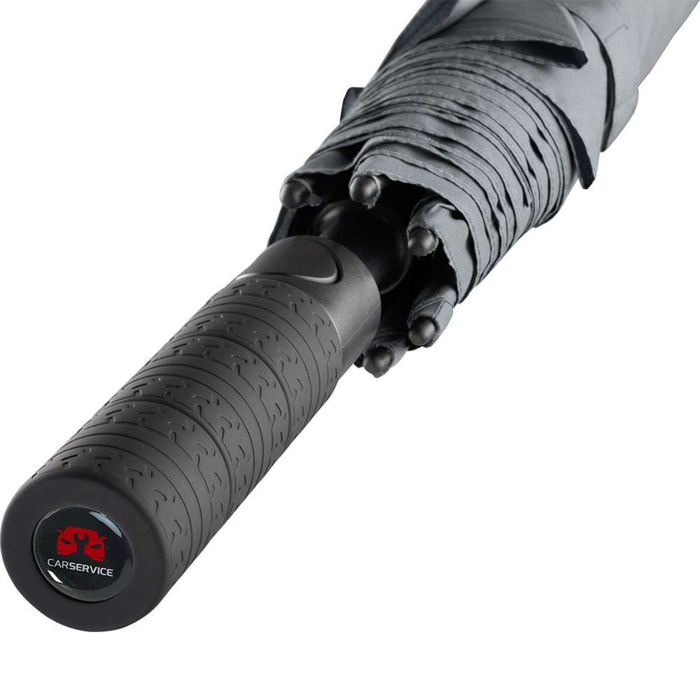 Exklusiver Automatik-Golf-/Gästeschirm für zwei Personen mit Reifenprofil-Design-Elementen Komfortable Automatik-Funktion zum schnellen Öffnen, hochwertiges Windproof-PLUS-System für eine maximale Gestell-Flexibilität bei stärkeren Windböen, flexible Fiberglasschienen mit grauen Gelenken, handsympathischer Soft-Feel-Griff im Reifenprofil-Design mit integrierter Auslösetaste und Werbeanbringungsmöglichkeit. Auch als Taschenschirm (Art. 5455) erhältlich.