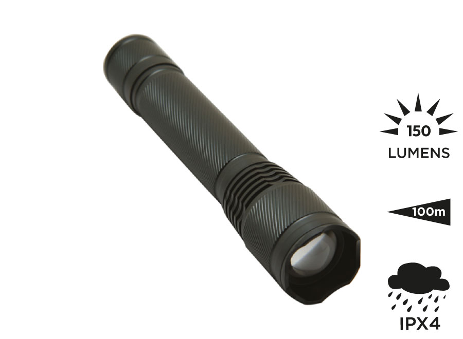 Griff aus eloxiertem Aluminium. 3-Watt-LED. Fokussiersystem zur Erhöhung der maximalen Beleuchtungsreichweite durch Bündelung des Lichtstrahls. Dichtungen an jedem Gewinde für bessere Wasserdichtigkeit (nicht eintauchen). Ein- / Ausschaltknopf am Lampenende. Funktioniert mit 2 LR06 AA-Batterien (im Lieferumfang enthalten). LED-Leistung: 3W (150 Lumens). Strahllänge: 100 cm. Wasserbeständigkeitsniveau: IPX-4. Wird in einer Geschenkbox geliefert.