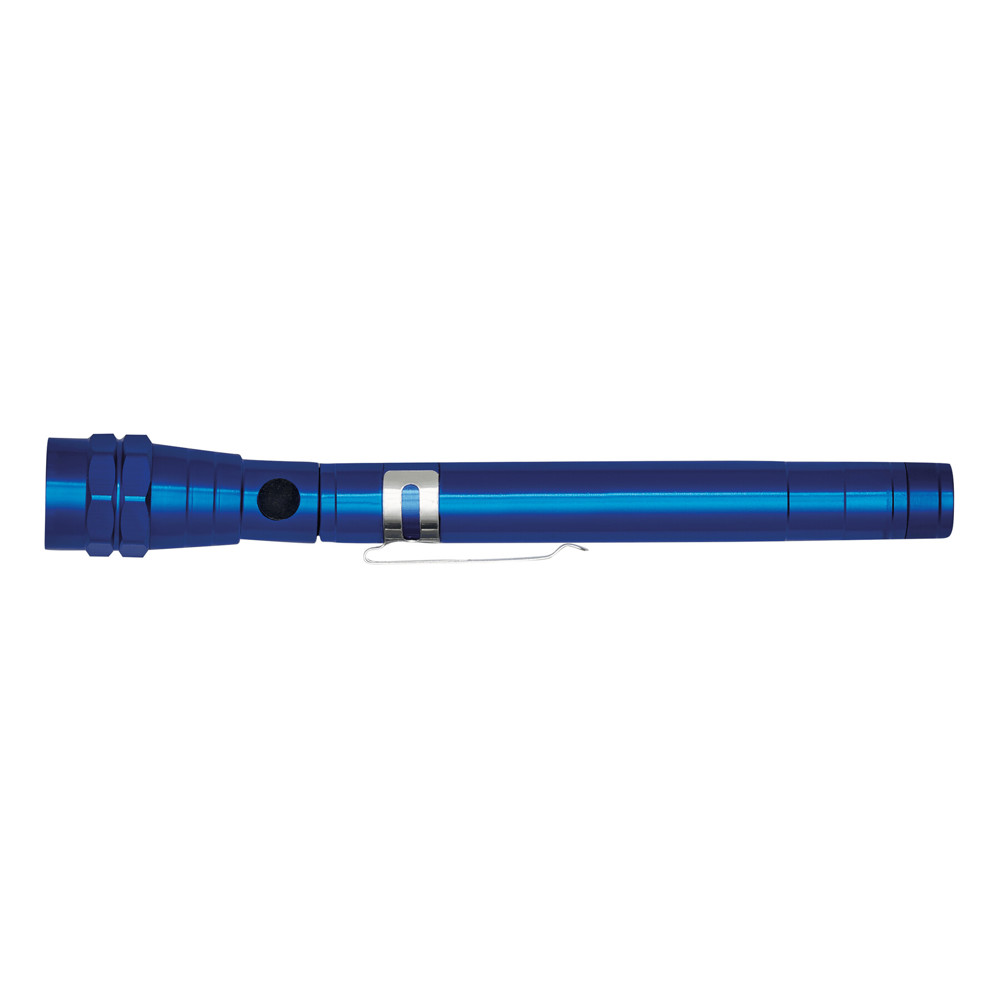LED-Taschenlampe REFLECT: 3 lichtstarke weiße LED, gummierter An- und Ausschalter, mit bis auf ca. 55 cm ausziehbares Teleskopsystem, schwenkbarer Lampenkopf, Magnetring, praktischer Befestigungsclip, Gehäuse aus Aluminium, batteriebetrieben (4x LR44 Knopfzellen enthalten), in Box