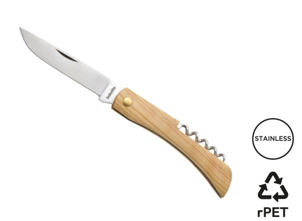 Klappbares Messer mit Klinge aus rostfreiem 420er Edelstahl. Griff aus Olivenholz. Korkenzieher mit 5-Spiralen. Messerschließung durch Zwangsfeder. Wird in einem melierten grauen Etui aus RPET geliefert.