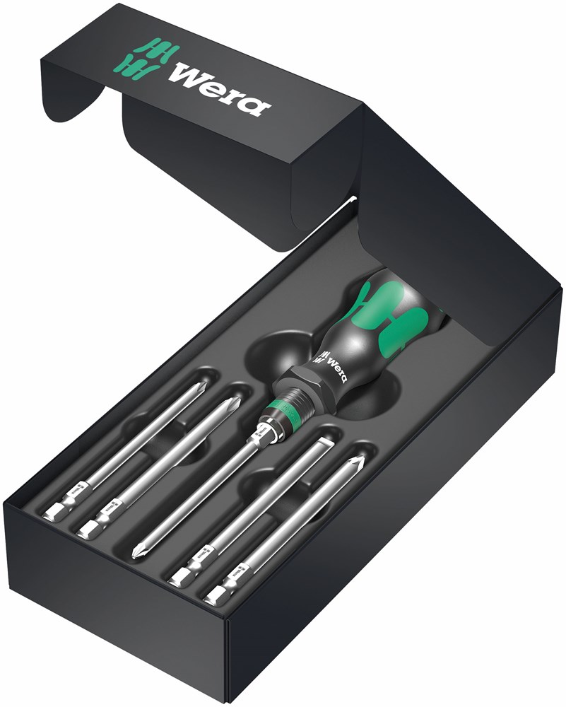 Handhalter Kraftform mit Schnellwechselfutter Rapidaptor. Schnellwechselfutter Rapidaptor erlaubt schnellen Bitwechsel. Zähharte Bits für den universellen Einsatz. Ergonomischer Kraftform Griff für ermüdungsarmes Arbeiten