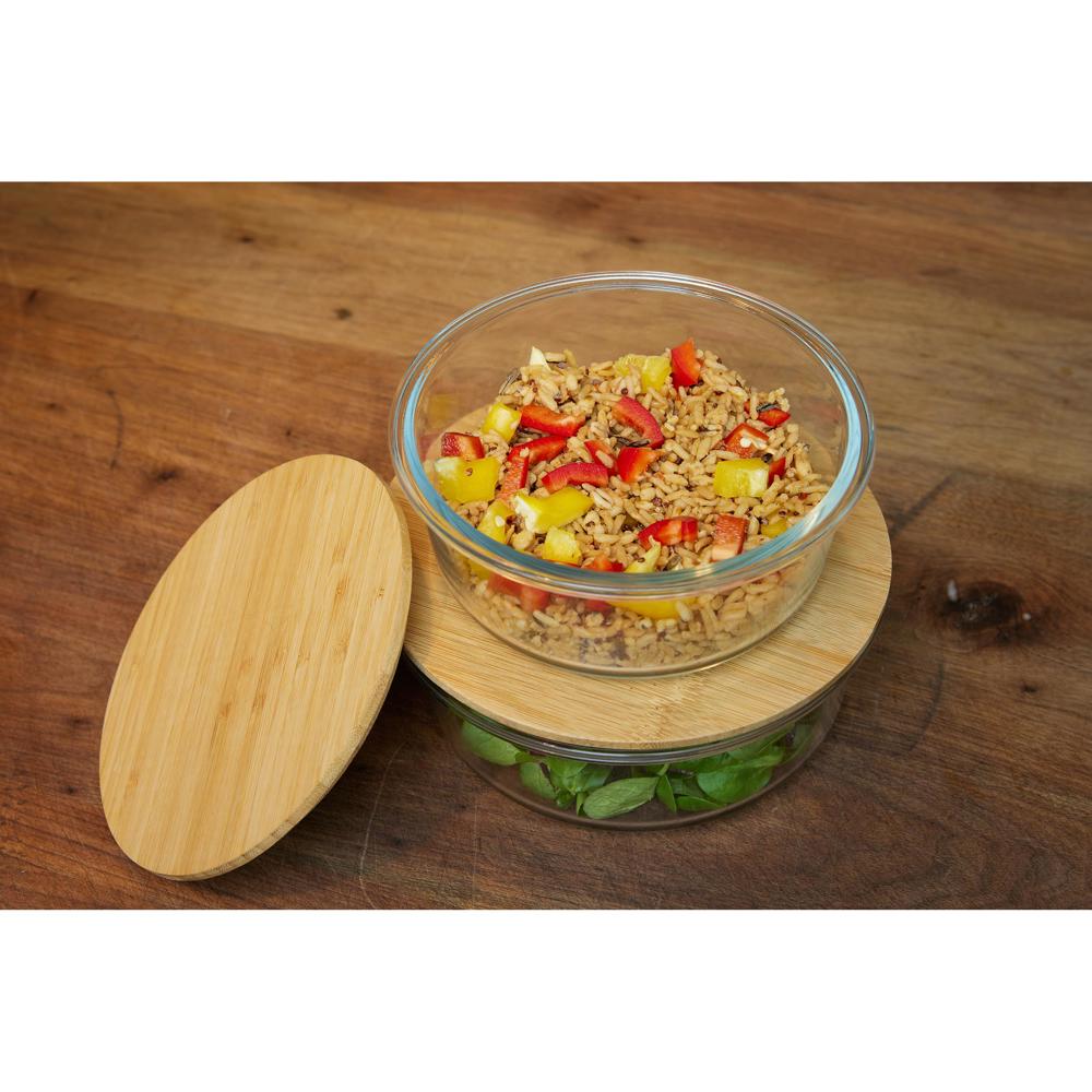Schöne runde Box mit einer Schale aus hochwertigem und hitzebeständigem Borosilikat-Glas. Der Deckel aus Bambus verfügt über einen Silikonring und hält somit besonders gut auf der Schale. Die Glasschale ist für die Verwendung in der Mikrowelle geeignet.