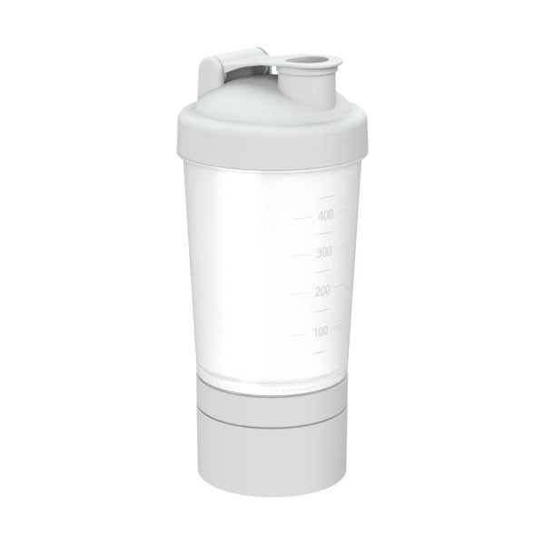 Shake it up! Ideal für den Eiweiß-Shake nach dem Training. Dieser modulare Shaker mit geprägter Skala in 50 ml Schritten und Schraubdeckel mit verschließbarer Trinköffnung beinhaltet ein herausnehmbares Sieb, mit dem sich Shakepulver und Flüssigkeit bei gutem Schütteln optimal vermischen. Zusätzlich verfügt dieser Shaker über zwei abnehmbare Kammern, welche sich separat befüllen lassen. In der kleineren Kammer befindet sich zudem ein herausnehmbarer 3-geteilter Einsatz. Der Mix- Becher lässt sich komplett auseinandernehmen und somit leicht reinigen. Füllmenge (Shaker ohne Zusatzfächer): 0,4 Liter.