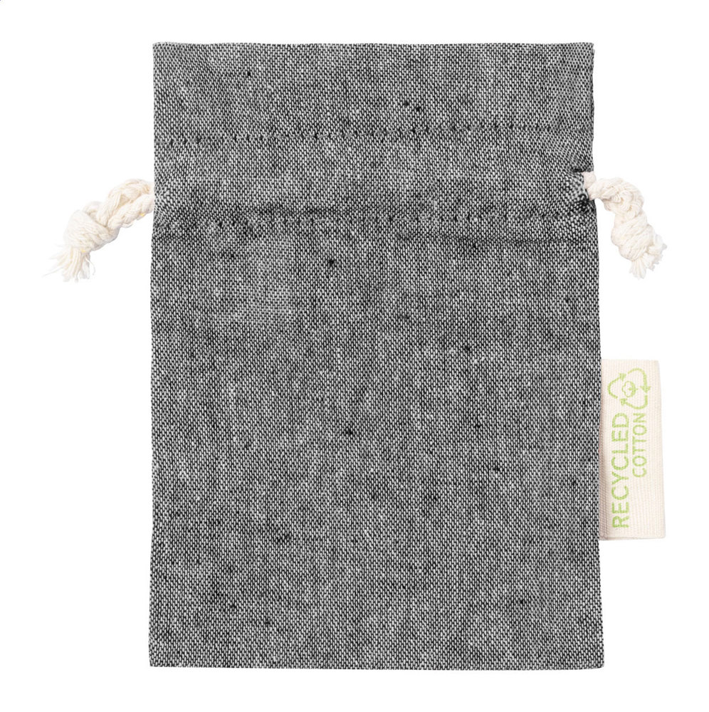 Geschenkbeutel aus recycelter Baumwolle mit Kordelzugverschluss. Mit Lable recycelte Baumwolle. Material: 100 % recycelte Baumwolle, 120 g/m².