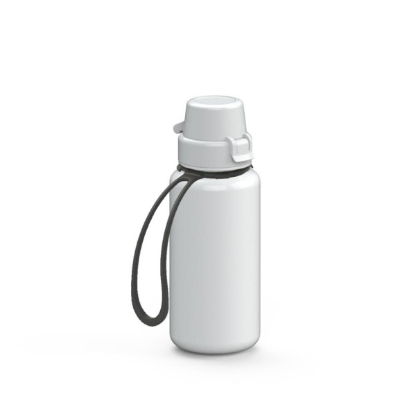 Die perfekte Flasche für Kindergarten, Schule und Freizeit. Praktische und geschmacksneutrale Trinkflasche aus robustem TritanTM mit Strap aus Silikon. Dieser ermöglicht zum Beispiel einen einfachen Transport der Flasche am Handgelenk. Durch die große Öffnung lässt sich die Flasche leicht befüllen. Der kindgerechte Verschluss ist leicht zu öffnen. Füllvolumen: 0,4 Liter.