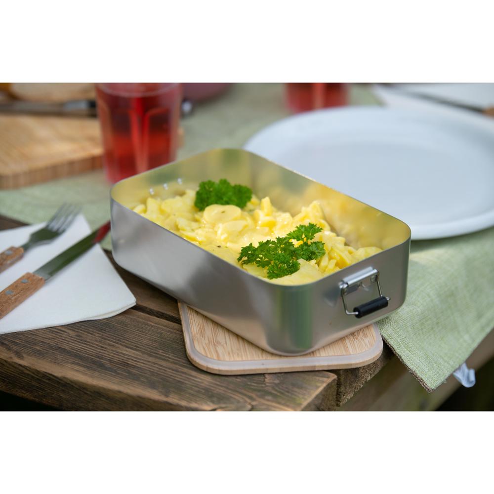Große, plastikfreie Brotzeitbox für Ihre Promotion. Die Dose besteht aus Aluminium, der Deckel ist aus Bambusholz und verfügt über einen Silikonring und Klemmbügel für ein sicheres Verschließen. Der Deckel ist komplett abnehmbar und kann bei Bedarf auch als Schneidbrett verwendet werden.