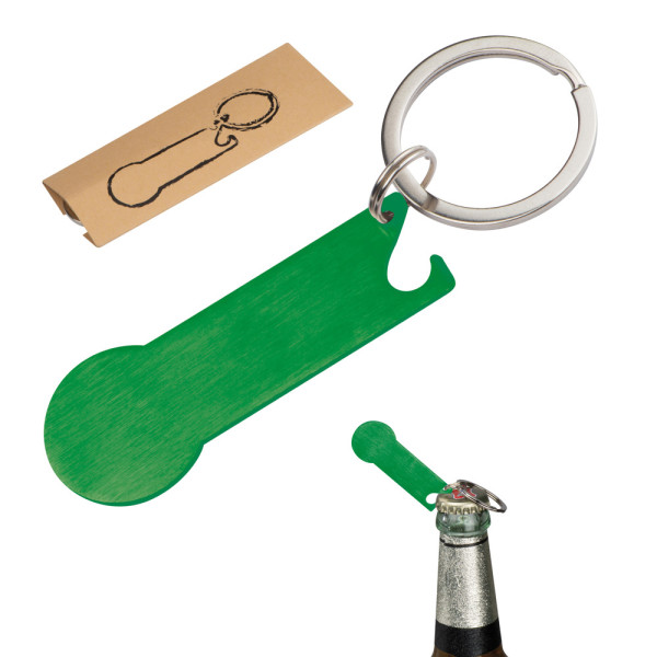 Schlüsselanhänger aus Edelstahl mit integriertem Einkaufswagenchip, Schlüsselring und Flaschenöffner. Ihre Werbung wird auf den Anhänger gelasert.