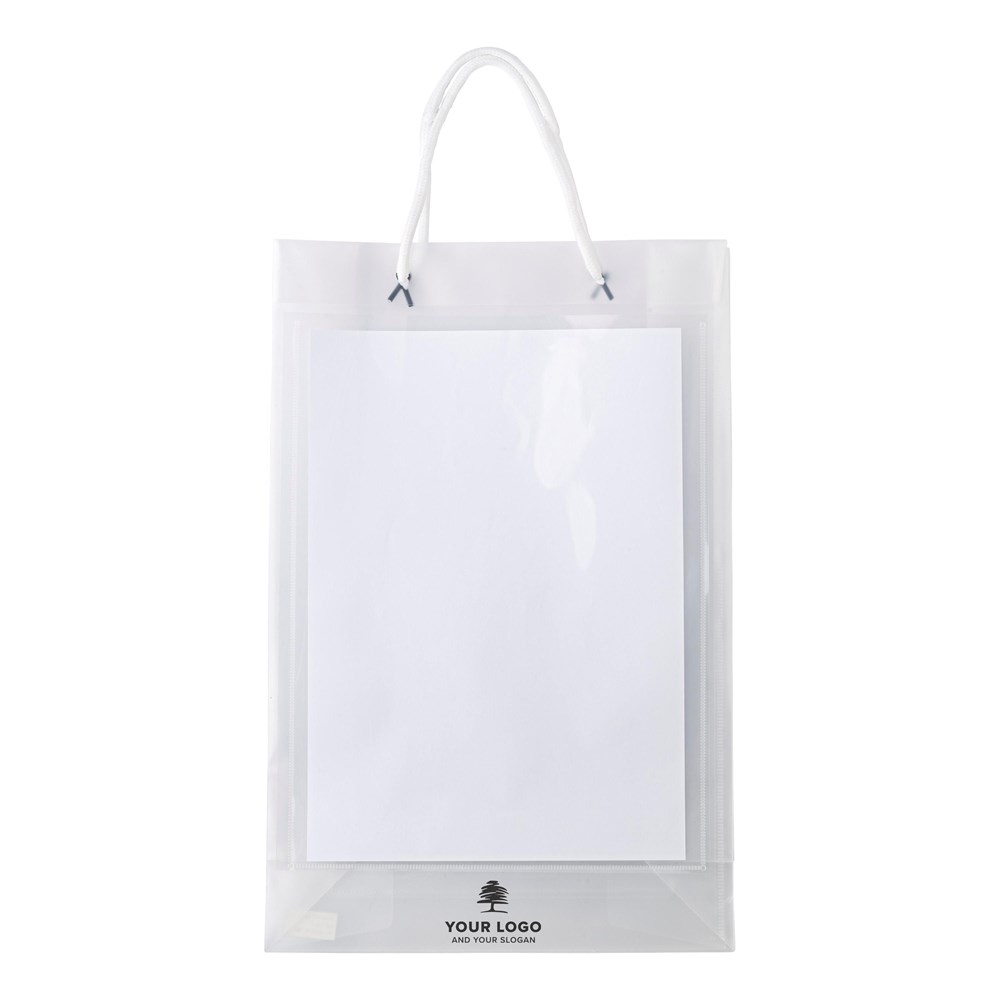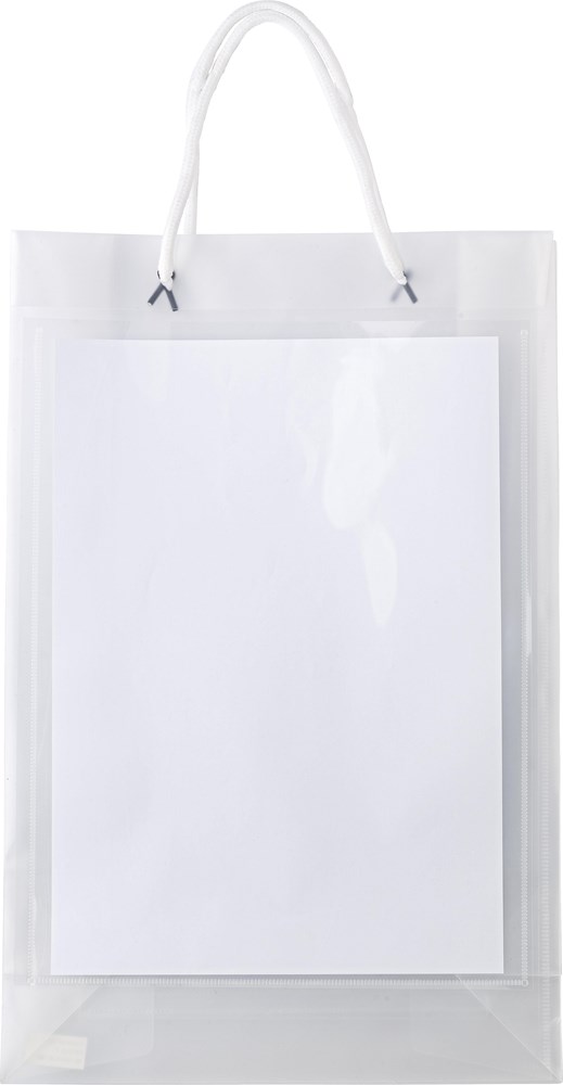 Tragetasche aus PP, im DIN A4-Format, mit Tragekordeln und Frontfach.