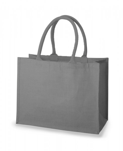 Material: 100% Jute Farbe: grau Größe: ca. 33x42 cm Boden- und Seitenfalte: ca. 19 cm Ausführung: 2 lange Henkel (ca. 60 cm), grau Zertifikate: Oeko-Tex Standard 100, LFGB